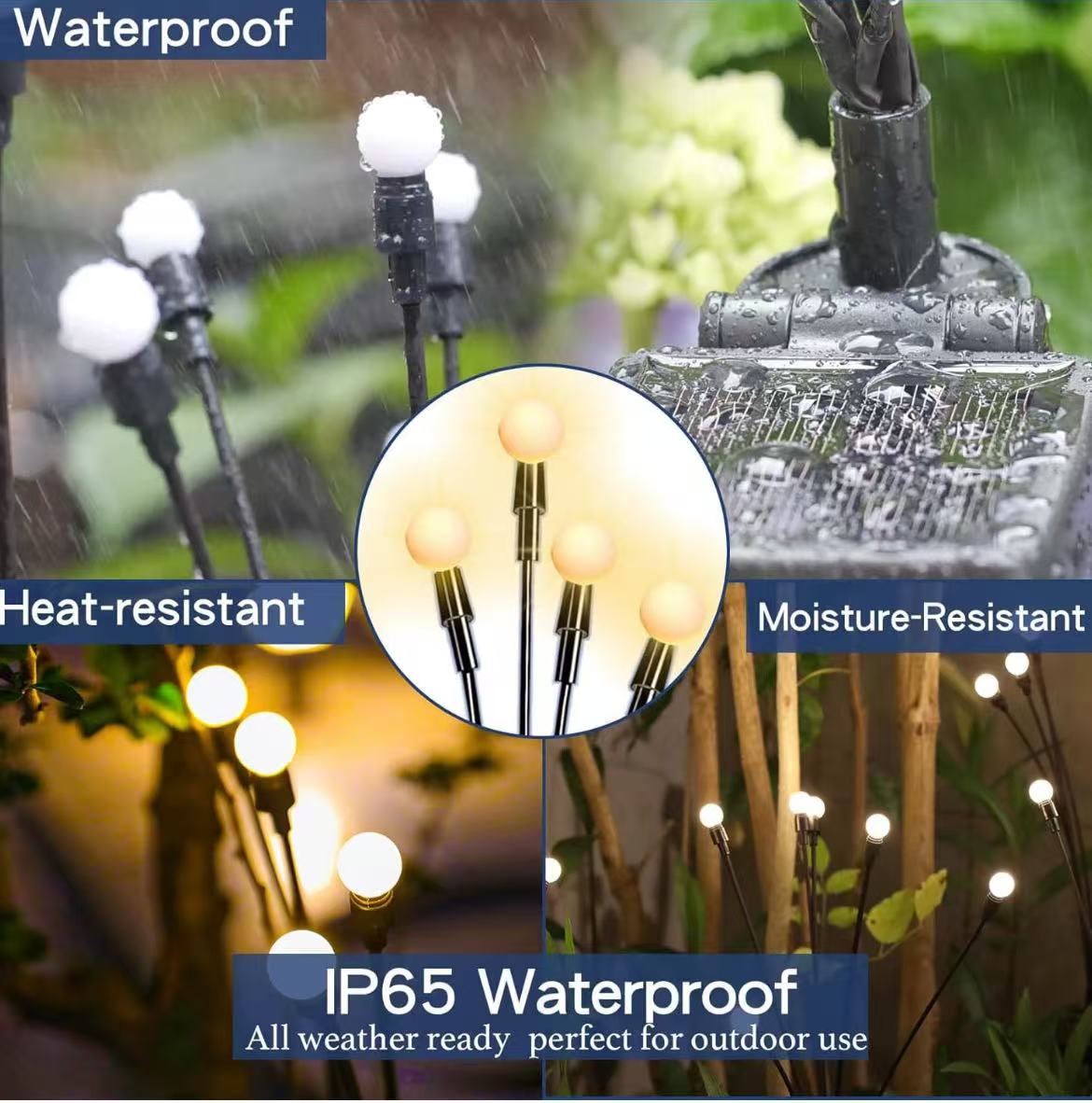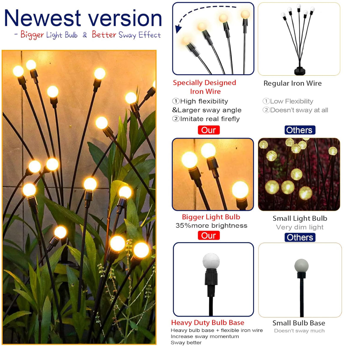Our new-generation solar outdoor lights are supported by ultra-soft and flexible wires. When the breeze passes, the lights gently sway, just like a group of fireflies flying in the dark. Equipped with 8 larger and brighter premium LED bulbs, while most similar products only have 6 smaller LEDs, making them an excellent garden decoration.